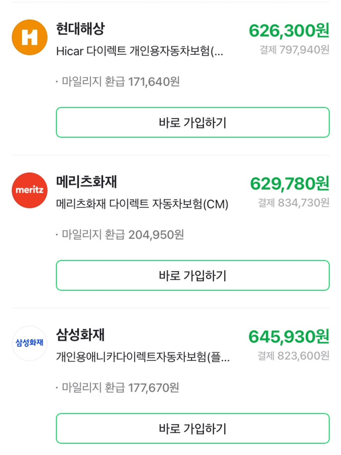 그리고 나면 바로 전 보험사의 예상 가격에 주르륵 뜬다!