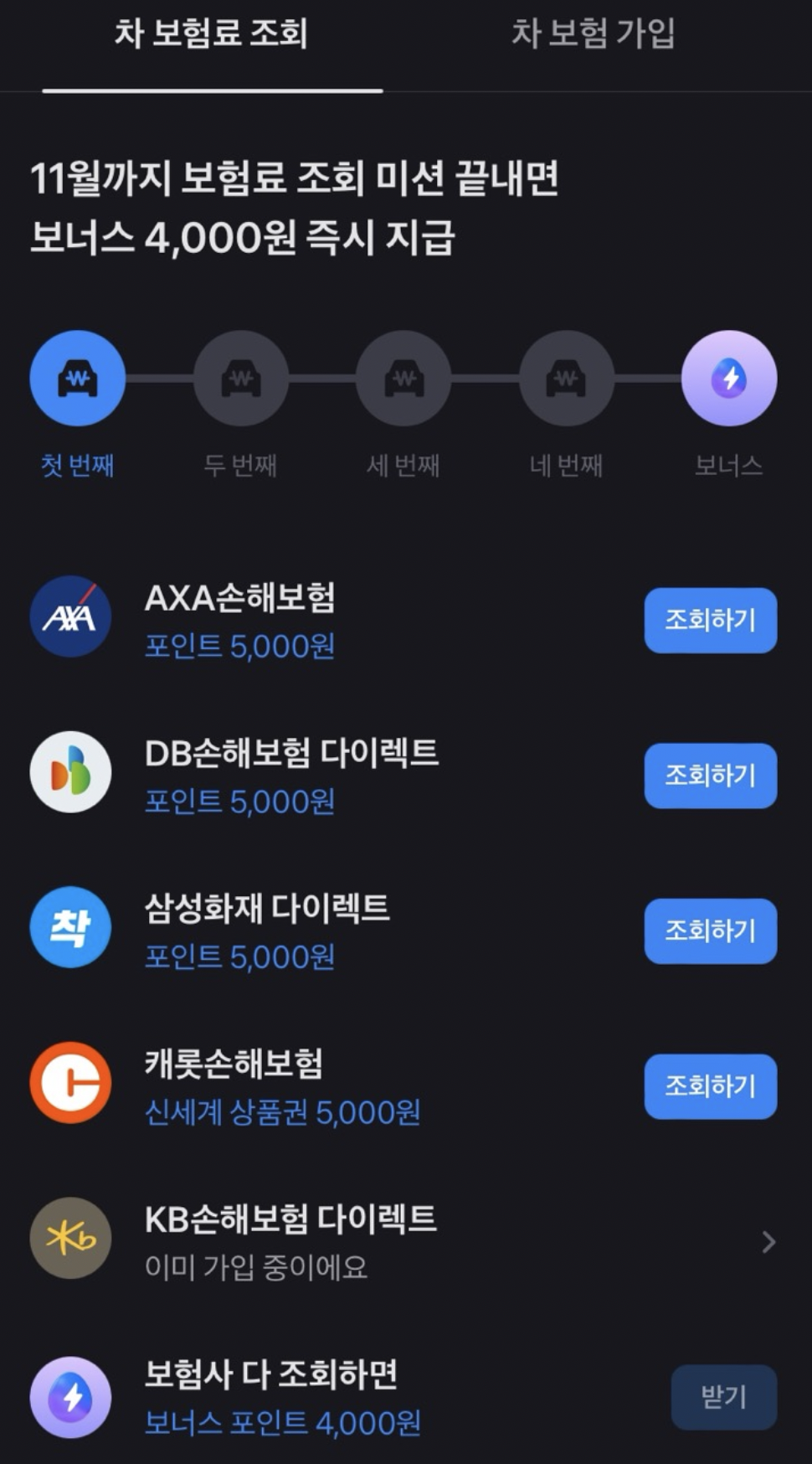 아. 그런데 한가지 차 보험료 조회 미션을 통해서 포인트/현금을 받는 서비스들이 많은데,
